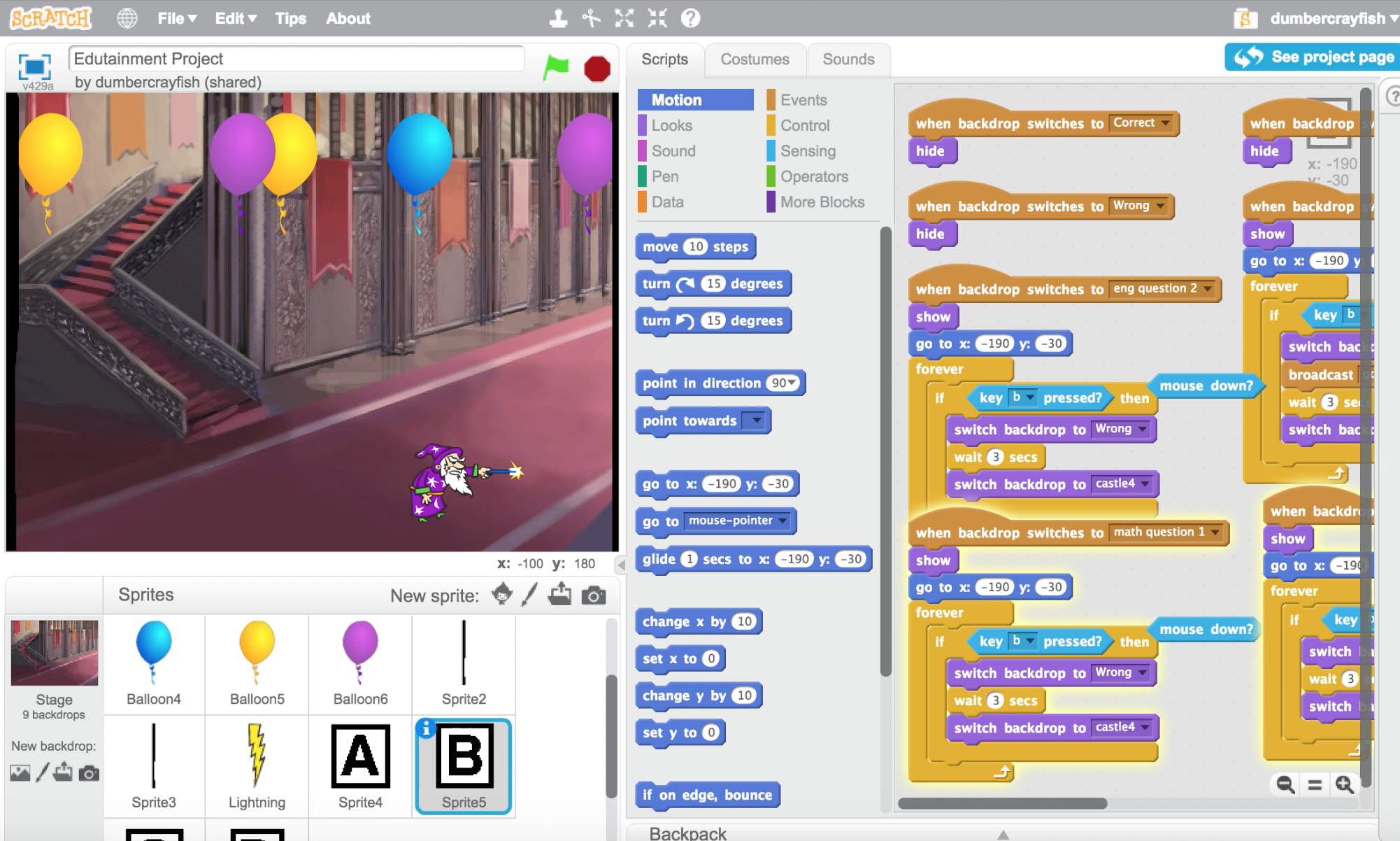 For one of my first projects in NMD120 I was asked to create a game with the program Scratch that had an educational aspect to it. For this I decided to make a game where the user shoots lightning bolts at balloons and depending on what balloon you popped you would get a certain type of question. This project taught me the basics of programing and game design.
